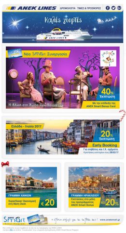 Ανταποδίδοντας την προτίμηση του πιστού επιβατικού κοινού στις υπηρεσίες των πλοίων του Ομίλου, το πρόγραμμα Seasmiles προσφέρει στα μέλη του έκπτωση 50% σε όλα τα δρομολόγια στις γραμμές Εσωτερικού για το διάστημα από 27/01/2017 έως 30/01/2017.