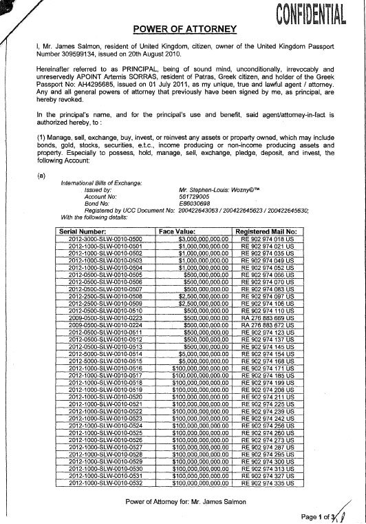 ΕΙΚΟΝΕΣ 13-15. Το πληρεξούσιο του διεθνούς κυκλώματος απατεώνων προς τον Αρτέμη Σώρρα τον Αύγουστο του 2012. Περιλαμβάνει όλους τους αριθμούς των πλαστών χρεογράφων.