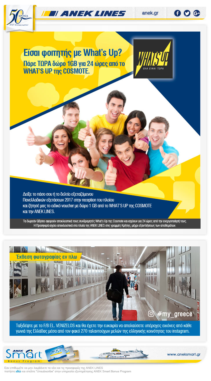 Δείξε το πάσο σου ή το δελτίο εξεταζομένου Πανελλαδικών εξετάσεων 2017 στην reception του πλοίου της ΑΝΕΚ και ζήτησέ μας το ειδικό voucher με δώρο 1 GB από το WHAT'S UP της COSMOTE και την ANEK LINES.