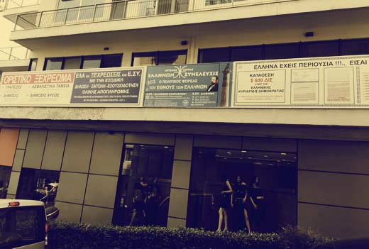 Λεζάντα φωτο : Τα γραφεία του «μεγάλου εθνικού ευεργέτη» Α. Σώρρα επί της λεωφόρου Βουλιαγμένης και Γραβιάς στην Αθήνα. Στην ταμπέλα υπάρχει φωτογραφία της δικαστικής απόφασης και ρεκλαμάρει: «ΚΑΤΑΘΕΣΗ $ 600 ΔΙΣ ΥΠΕΡ ΤΗΣ ΕΛΛΗΝΙΚΗΣ ΚΥΡΙΑΡΧΗΣ ΔΗΜΟΚΡΑΤΙΑΣ. Η΄ Μονομελές Πλημμελειοδικείου Αθηνών Απόφαση Αριθμός 67650/13».
